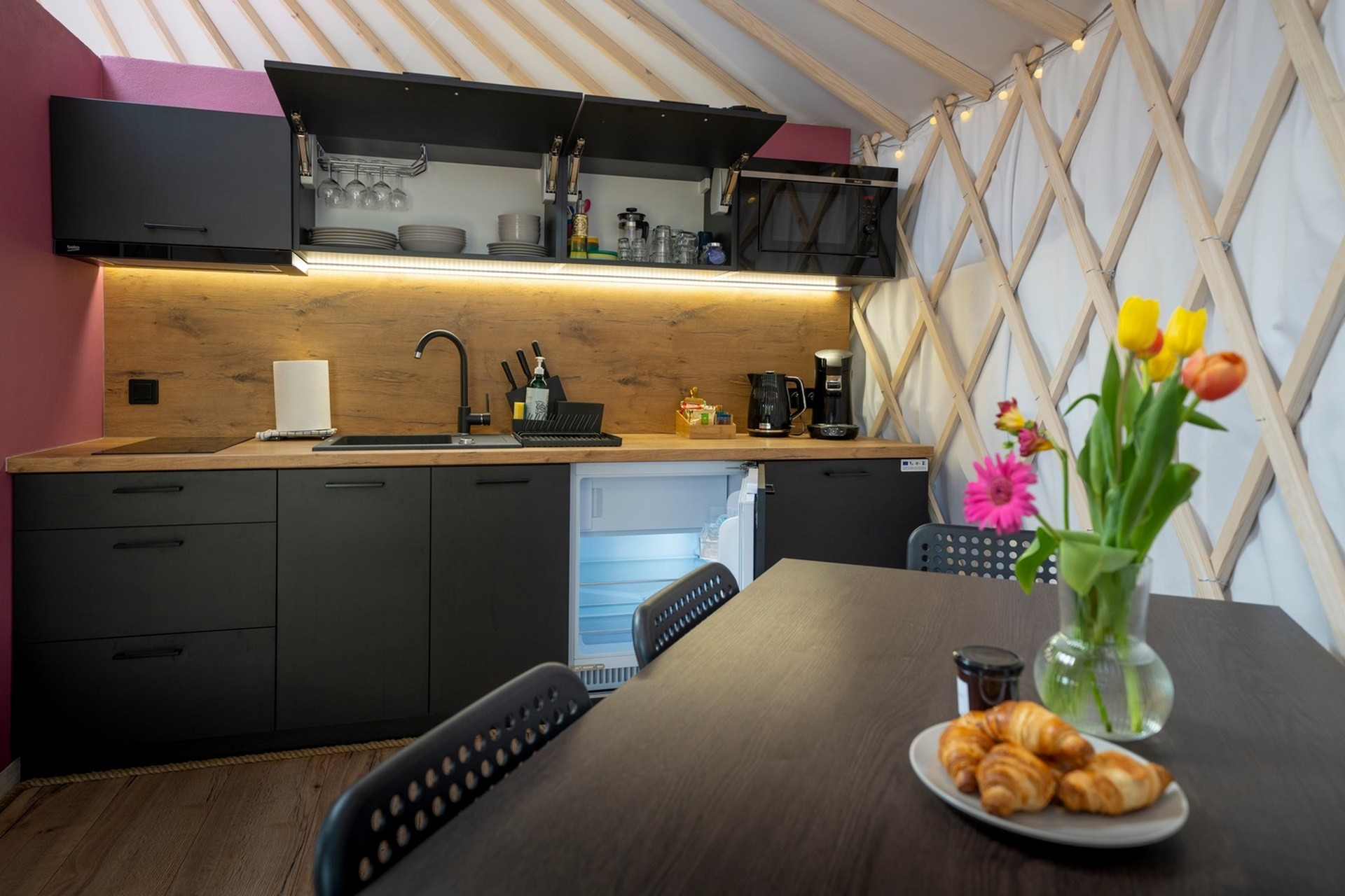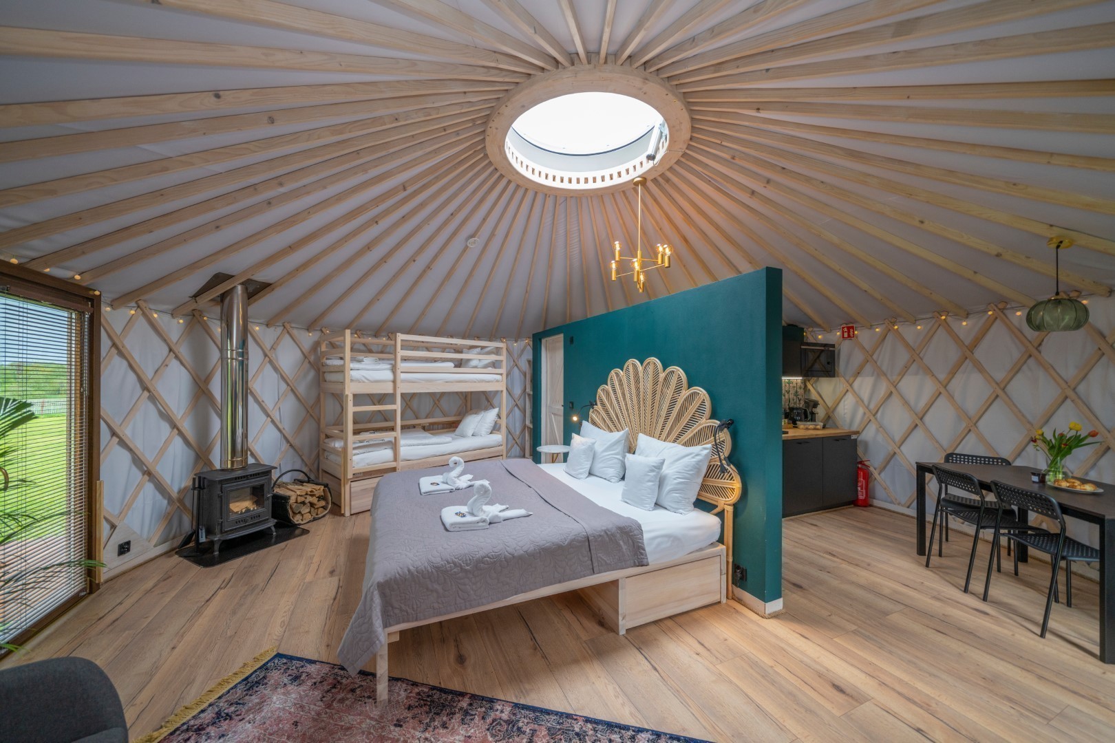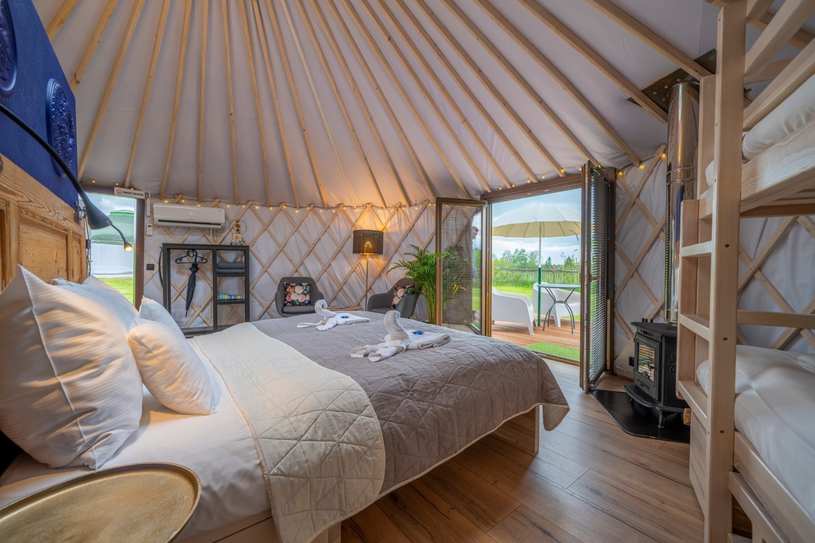 Nasze jurty zbudowane są dokładnie według tych samych zasad. Jedynie materiały i ocieplenie dostosowane są do naszego klimatu. W środku mamy jednak już pełen luksus – zamiast mat do spania, wygodne łóżka z japońskimi futonami. Zamiast otworu w szczycie dachu na wydostawanie się dymu – przeszklony świetlik do oglądania nieba. Nowoczesne chłodzenie i ogrzewanie klimatyzacją – pompą ciepła. A przede wszystkim łazienkę i aneks kuchenny.